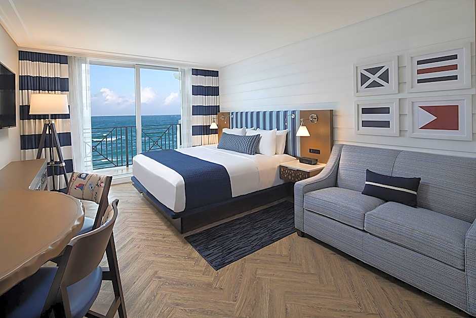 This room features an ocean view from its panoramic sliding glass doors that open onto a private balcony. The room is furnished in a nautical, coastal theme and offers upgraded linens, terry bathrobes, a small refrigerator, coffee maker and an in-room safe. A sofa bed, modern bath with shower and a 59-inch flat-screen TV are provided.